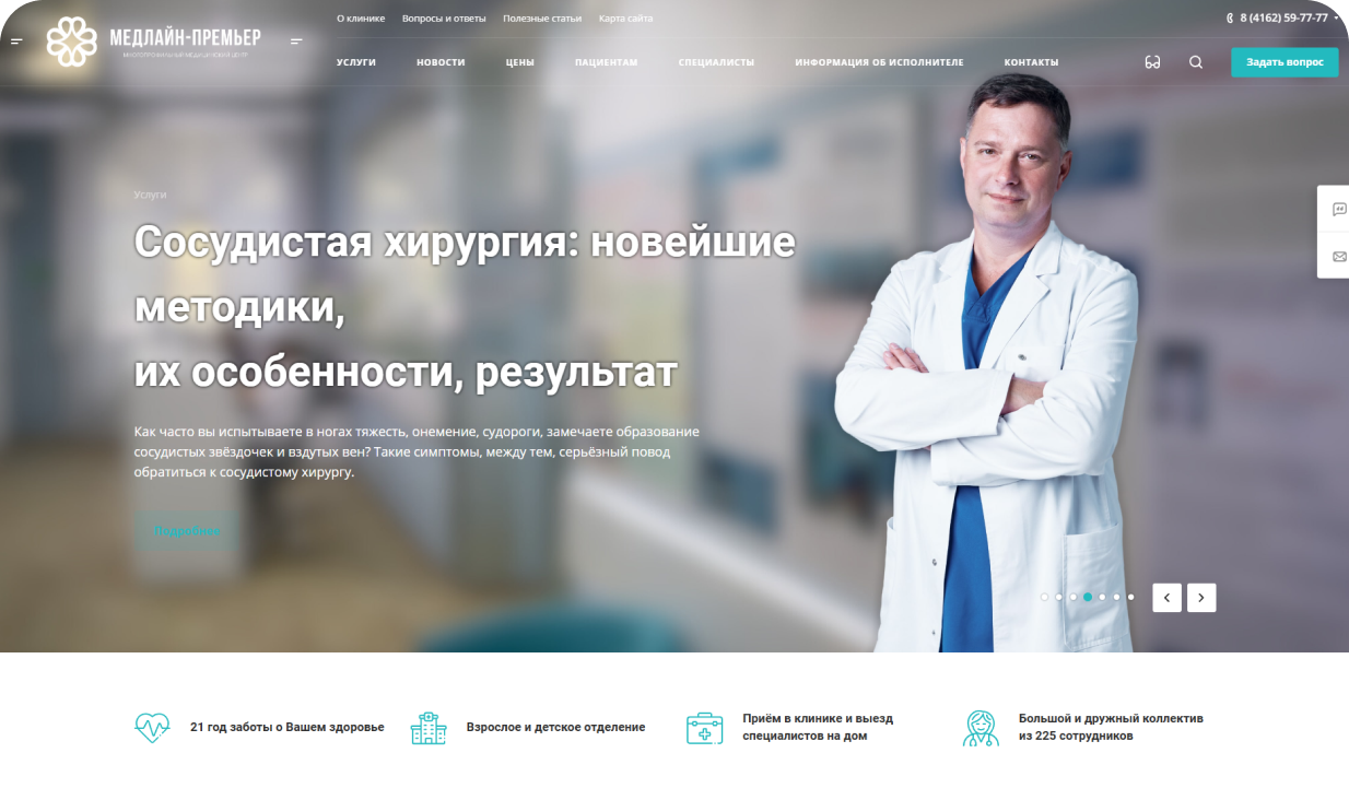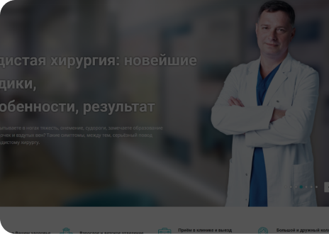 клиники, соединяющий взрослое, детское и диагностическое отделения. Включает каталог услуг,
