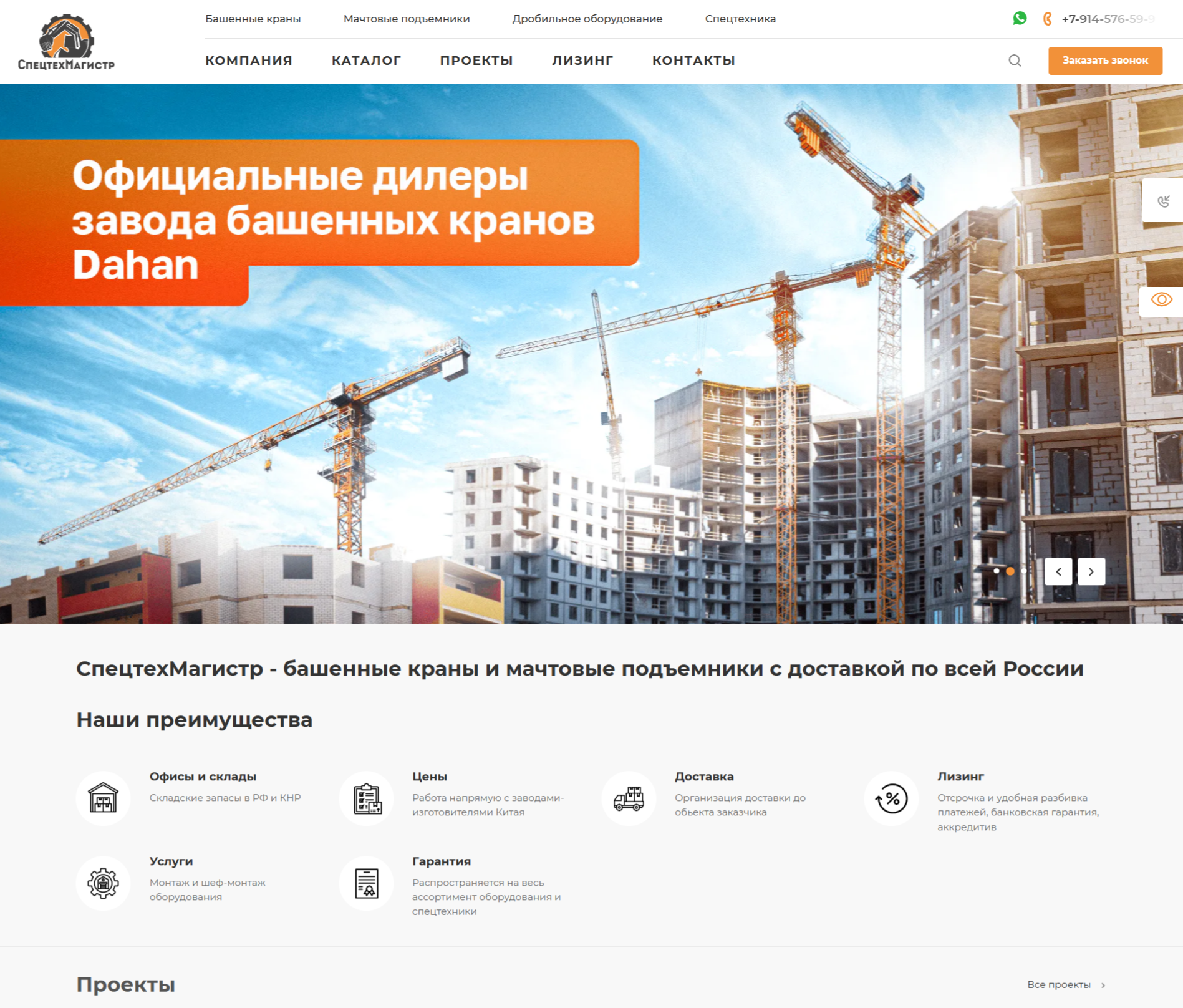 Сайт с каталогом спецтехники, фильтрами, карточками товара, интеграцией с внутренней CRM, формами заявки, разделом “о компании”, контактами. Упор на презентацию брендов, надежность поставок и скорость обработки заявок.