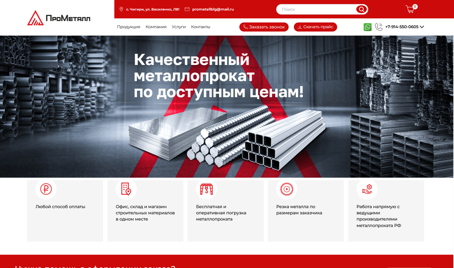Создан корпоративный сайт-каталог с удобной структурой: разделы по видам проката, услуги резки и доставки, формы заявки. Сделан акцент на надежности и ассортименте, разработан строгий дизайн под B2B-сегмент. Оптимизирована скорость загрузки и базовое SEO. Сайт помогает компании получать новые заказы и укреплять имидж на рынке.